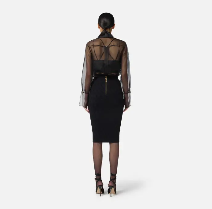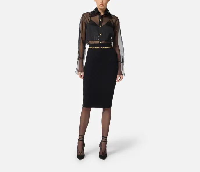 Slim fit knit pencil skirt. With high waist, it stands out for its intricate 3D work that creates a geometric diamond pattern along the entire length. It is embellished with a diamond-shaped chain with logo and rhinestones decorating the waist.