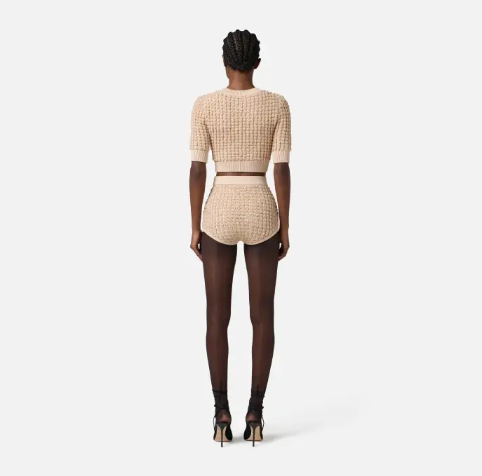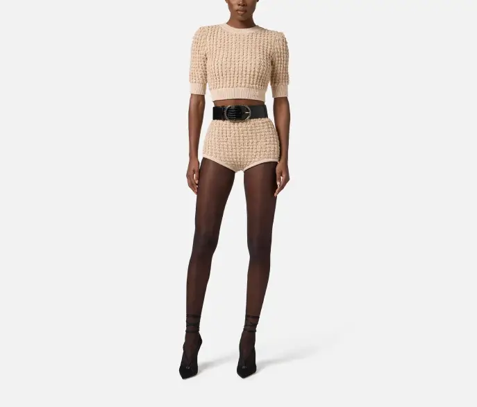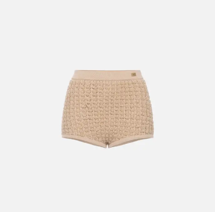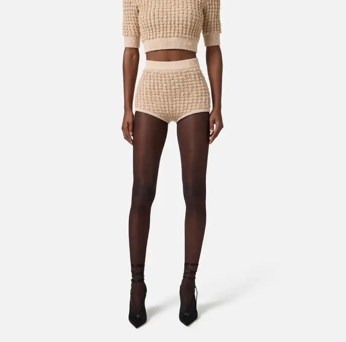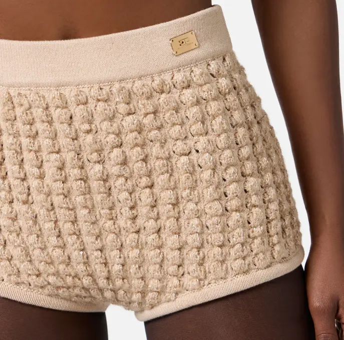 Shorts in bouclé fabric with slim fit. Enhanced by the micro-sequins sewn into the weave, they are personalised by the golden metal logo plaque on one side.