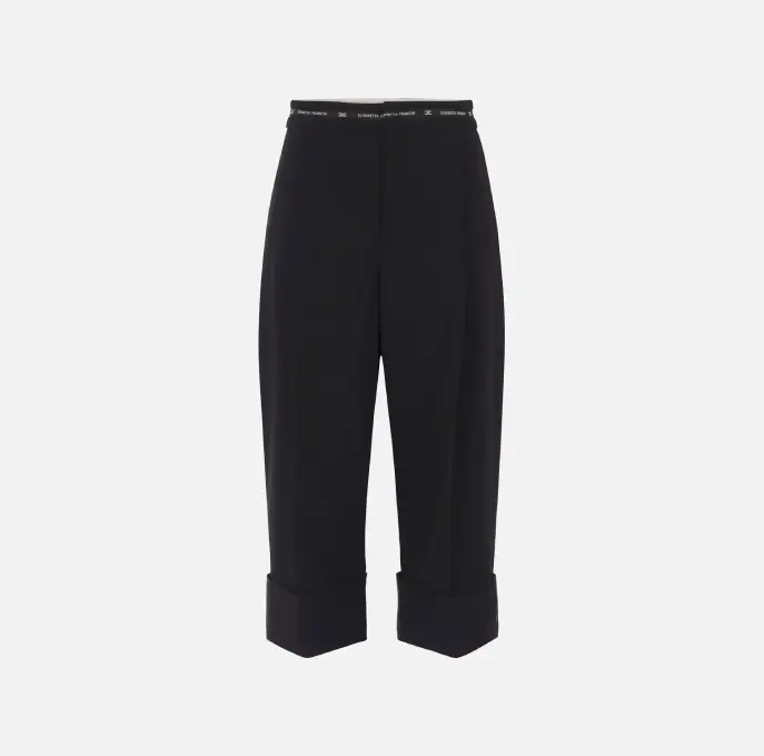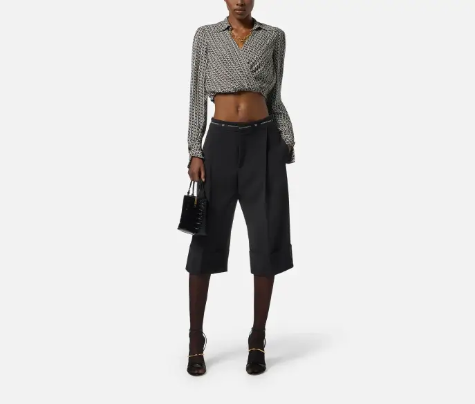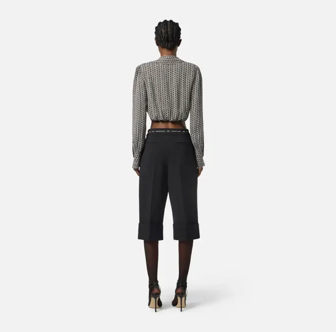 Bermuda shorts in lightweight crêpe fabric with regular fit. The stylish detail is the ribbon at the waist inspired by men’s tailoring placed on the outside of the garment with a contrasting logo. The length is below the knee with turn-ups at the hemline.