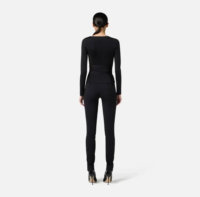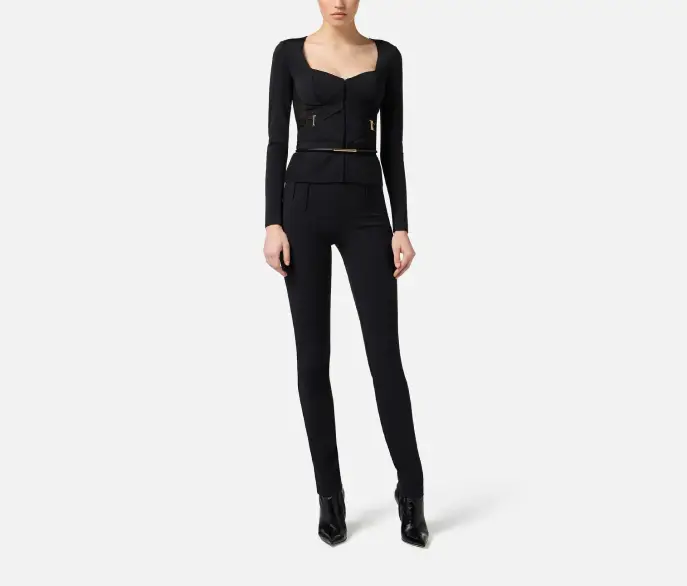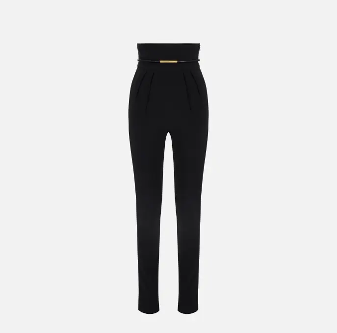 Lightweight crêpe palazzo trousers with a slim fit and loose leg bottom. They stand out for the matching details such as ribs that give definition. The high waist is embellished with the tubular belt with golden metal central detail for a touch of light.