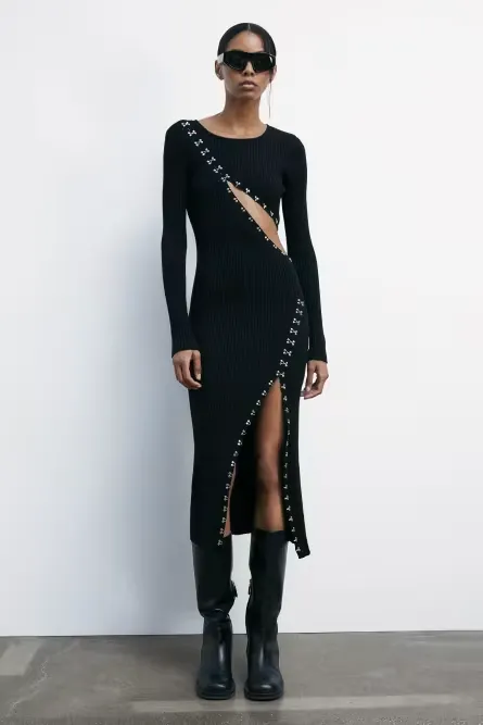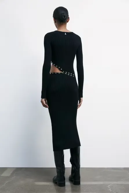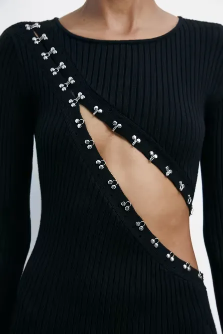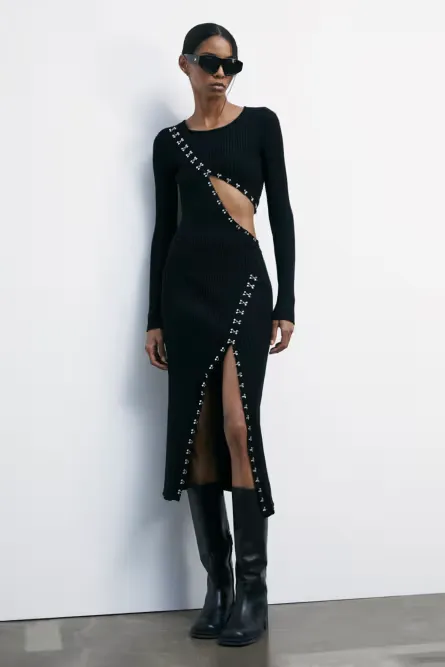 Soft ribbed-knit midi dress with a glam-rock allure. Metallic-hook slashes reveal and sculpt the silhouette, tracing sensual lines from shoulder to waist, down the side to the hem. A statement piece embodying Patrizia Pepe’s bold, fearless femininity.